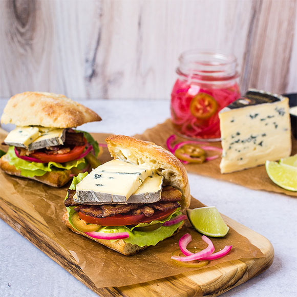 4. Ta underdelarna av bröden och bred ut 1 msk majonnäsblandning på varje ciabatta. Toppa mackorna med lite picklad lök och jalapeños, lägg på lite bacon, sallad och tomat. Avsluta med en skiva CAMBOZOLA Black Label.